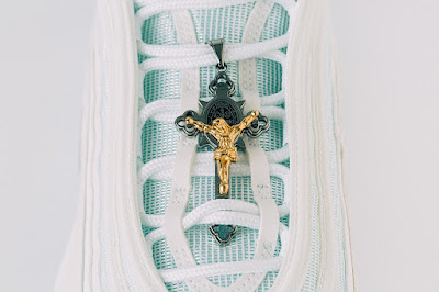 Pada bahagian lace digantung salib besi, pada hujung lidahnya ada setitis dakwat merah melambangkan darah Jesus dan pada bahagian tepi hadapan kasut disulam 'MT.14:25', merujuk kepada ayat daripada kitab Injil, Matthew 14:25 yang menceritakan kisah Jesus berjalan di atas permukaan air.