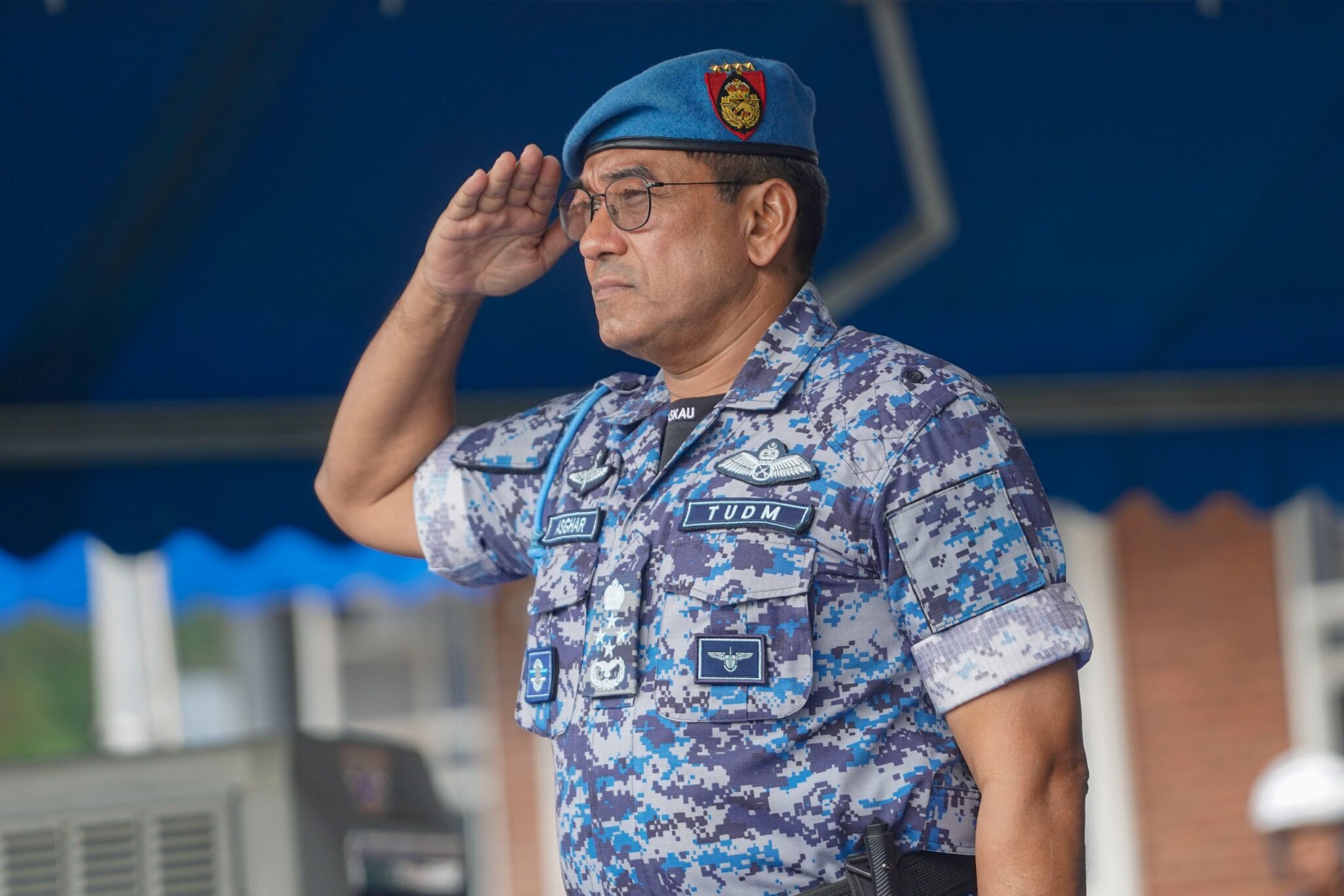 Mohd. Asghar ketika memberi tabik hormat pada Anugerah Kecemerlangan TUDM 2023 di Pangkalan Udara TUDM Subang, hari ini. - Foto oleh FARIZ RUSADIO / KOSMO!