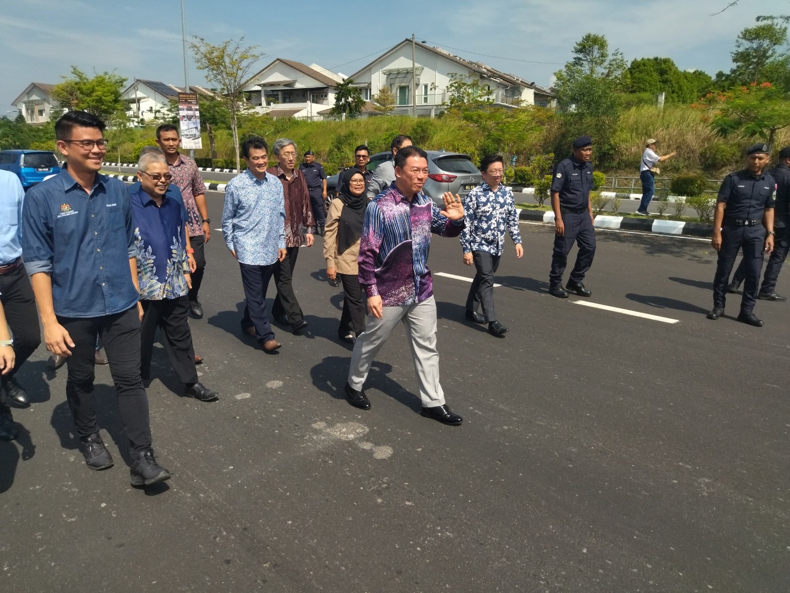 Kor Ming (tengah) melambai tangan semasa berjalan di jalan utama Bandar Seri Botani selepas merasmikan jalan itu di Ipoh hari ini.