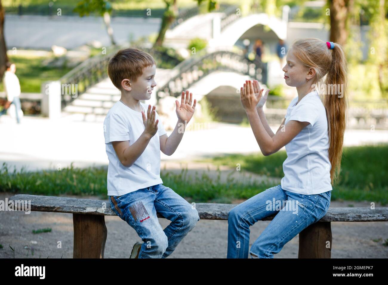 Gambar dua orang kanak-kanak sedang bermain tepuk tangan hi-5..