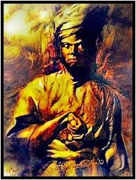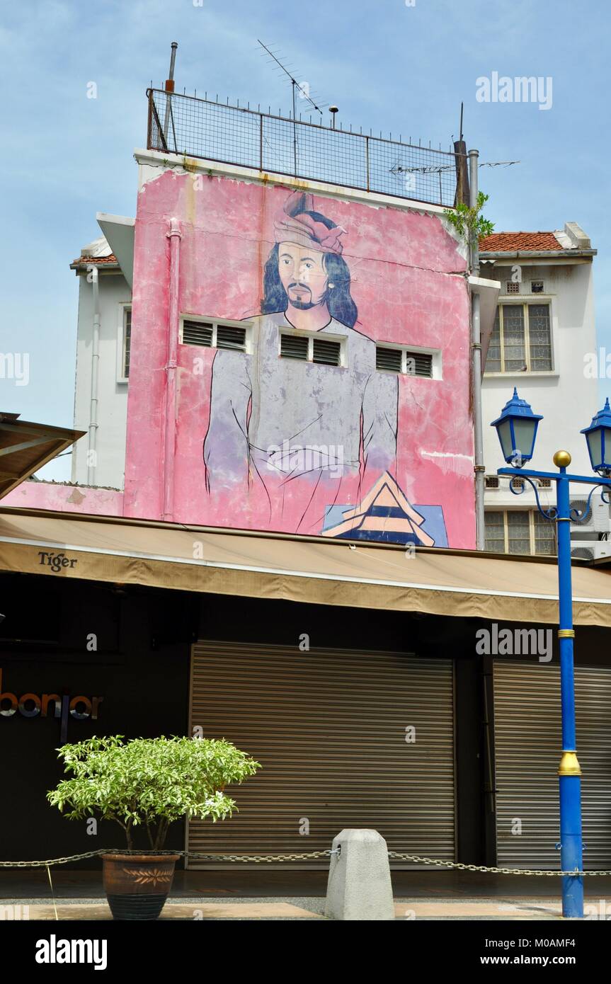 Mural Hang Tuah pada dinding... pakai baju merah maroon, samping kuning, pegang keris.