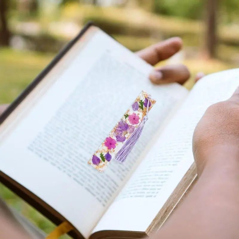 Ibu jari pemegang buku terletak di tengah-tengah antara dua halaman tersebut sambil menahan satu penanda buku yang ada lukisan perempuan sedang membaca buku dan corak-corak bunga...