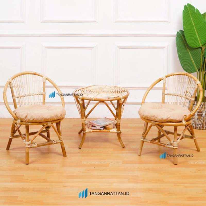 Ada set rotan... 1 kerusi rotan tunggal, 1 meja rotan bentuk oval, dan 1 meja rotan bentuk bulat yang diletak pasu putih bertanam pokok hiasan hijau...