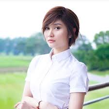 Seorang perempuan berambut pendek yang sedang tersenyum. Memakai baju berwarna putih di dalam. Jaket yang di luar juga berwarna putih dan ada macam corak kerawang di tengah2. Kerawang warna kuning keemasan.