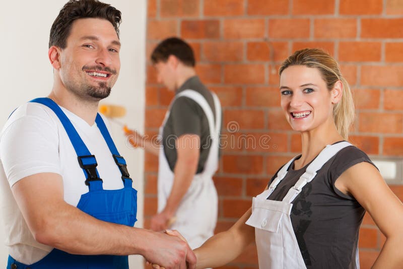 Seorang lelaki sedang bersalaman dengan seorang perempuan, sambil diperhatikan oleh seorang kawan lelaki mereka.