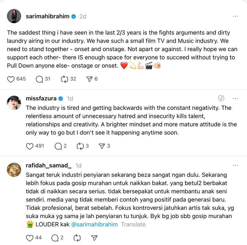 Menerusi satu hantaran di Threads, Sarimah meluahkan kekecewaannya terhadap budaya negatif yang kini menjadi seakan-akan norma dalam kalangan sesetengah penggiat seni, dari pertelingkahan terbuka hingga pembongkaran aib rakan seindustri secara tanpa segan silu.