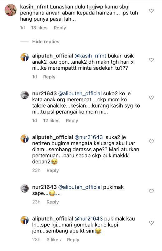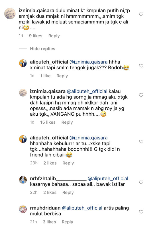 ada netizen pg komen kt ig ali pasal ni. dia balas kt netizen "p**t*t kau la"