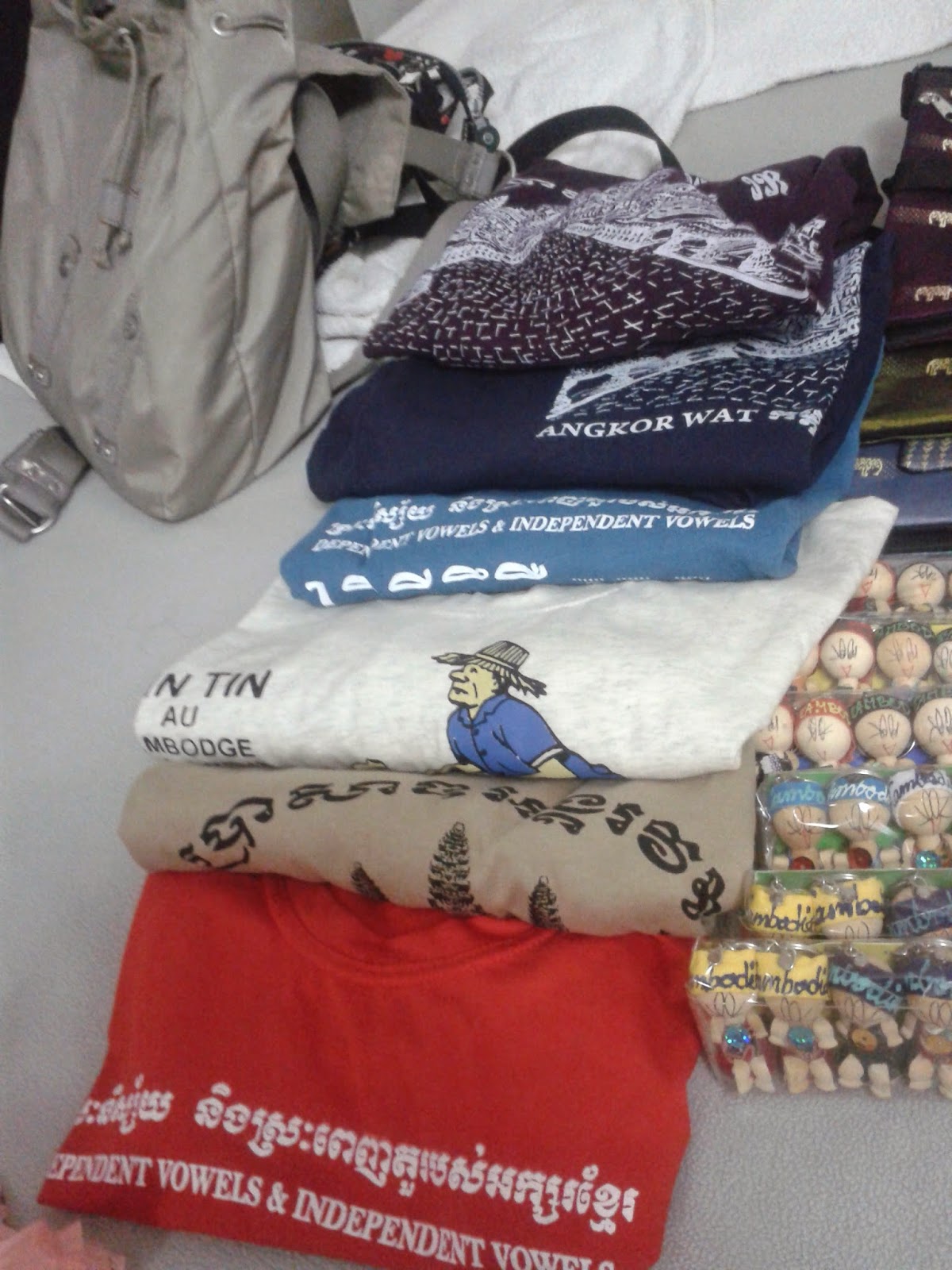 Some shopping estimates Keychain Doll USD5 for 30 pieces Keychain silver USD2 for 6 pieces Fridge Magnet Stone USD4 for 10 pieces T-shirts –adult/child USD2 per piece Cambodia silk USD14 Cambodia silk + satintop USD8 Bracelet – Cambodianstones USD75-50 Bracelet – Sri Lankastones USD25-15 Rings USD20-10