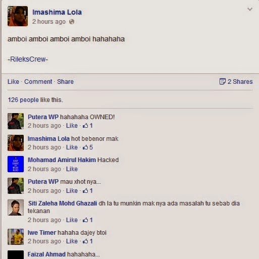 Penggodam turut memuatnaik status yang mengundang kemarahan di akaun Facebook kepunyaan Imashima Lola itu, menyebabkan ramai pelayar Facebook meninggalkan komen dan kata-kata kecaman kepada pemilik asal akaun tersebut.