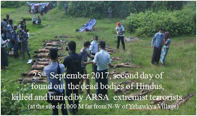 According to American Burmese researcher Rich Heizman, almost all the inhabitants of Ye Bauk Kyar village, three miles from the Bangladeshi border, were hacked to death with machetes, swords and axes by the "Bengali" Islamist terrorists. 92 Hindus were also slaughtered in Kha Maung Seik village.