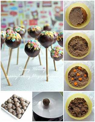 Bila dah siap, cucukkan Cake Pop yang siap dihias pada polystyrene supaya coklat boleh mengeras dan biarkan ia kering sepenuhnya. Teruskan menghias Cake Pop yang lain.