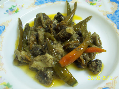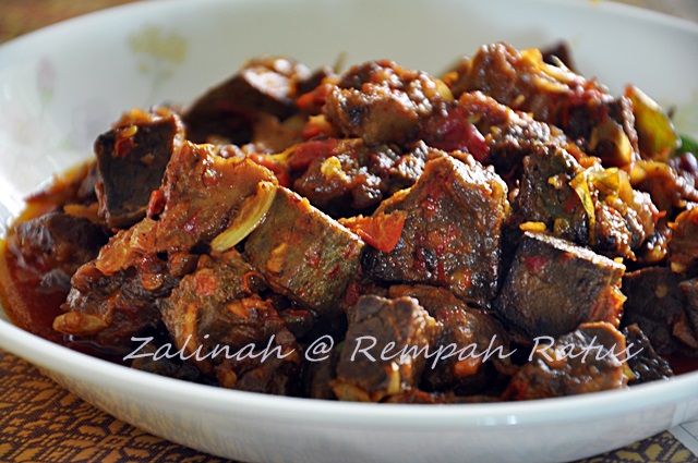 Daging, hati dan paru direbus empuk kemudian dipotong dadu kemudian digoreng sekejap.