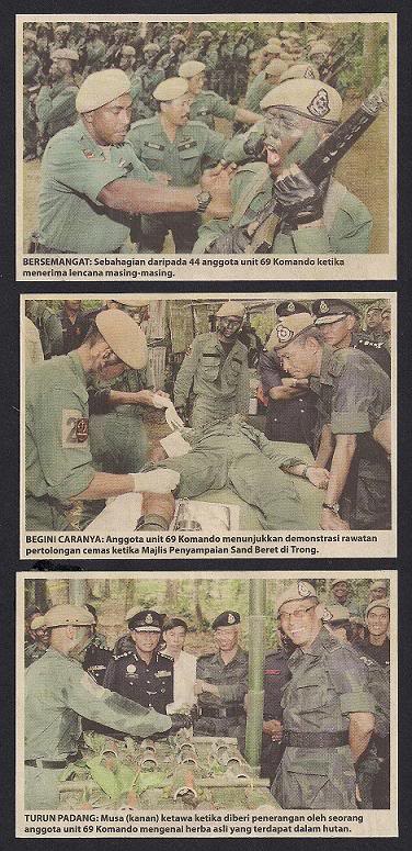 1. Saya ingin ceritakan pasal batalion badge 69.Terdapat gambar kerambit di kiri dan kanan dan lembing di tengah-tengah. Maksud lembing adalah dia adalah raja di hutan. Kerambit pula bermaksud membunuh musuh dengan cara senyap seperti terkena senjata kerambit. Tahu-tahu perut bocor usus terkeluar.