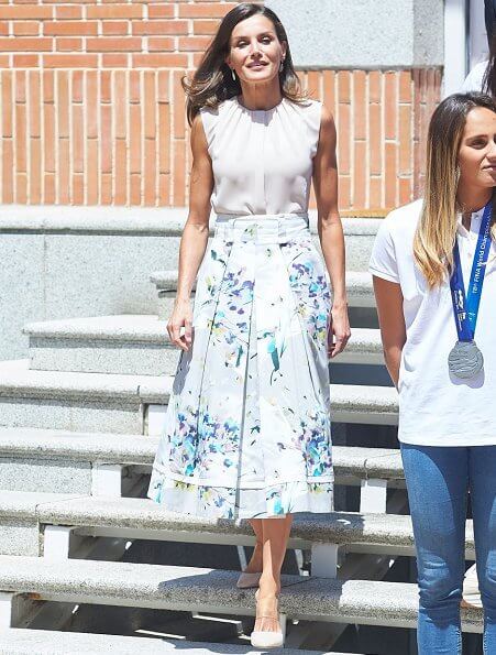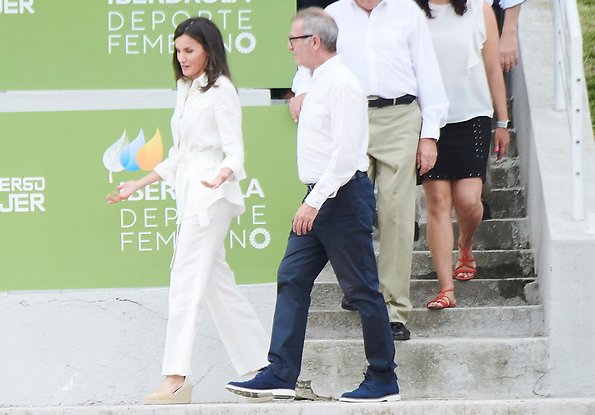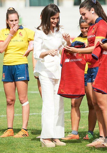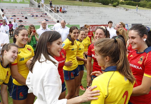 On July 4, 2019, Queen Letizia of Spain visited the training of the ‘National Women's Rugby Team 7’ participating in the next pre-Olympic tournament at Rugby Stadium of the Complutense University.