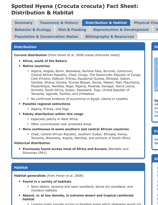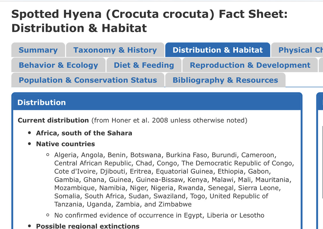 Spotted Hyena (Crocuta crocuta) Fact Sheet: Distribution & HabitatCurrent distribution (from Honer et al. 2008 unless otherwise noted)