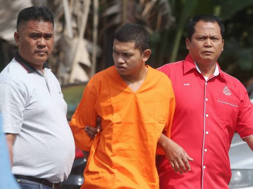 Suspek dilihat dibawa ke mahkamah kira-kira pukul 9 pagi ini dengan berpakaian lokap berwarna jingga dalam keadaan tangan bergari.