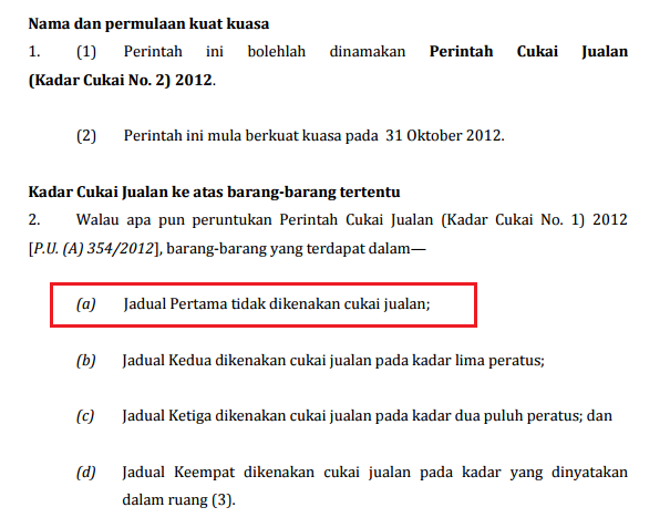 Betul ke ni? Mana buktinya? Buktinya ada di dalam Perintah Cukai Jualan (Kadar Cukai No, 2) 2012 yang juga telah digazetkan di mana seperti diterangkan didalam muka surat kedua Jadual Pertama tidak dikenakan cukai jualan.