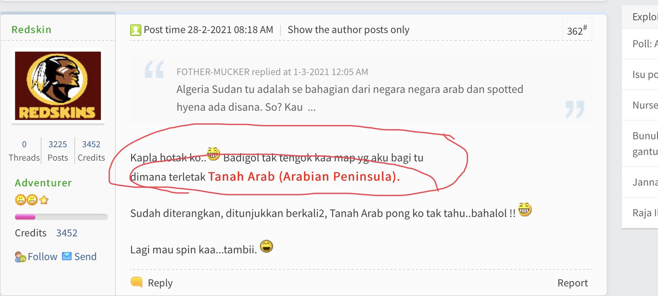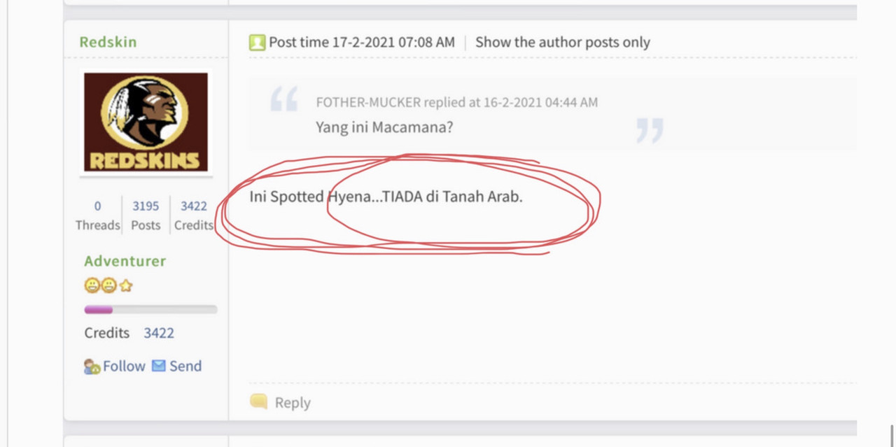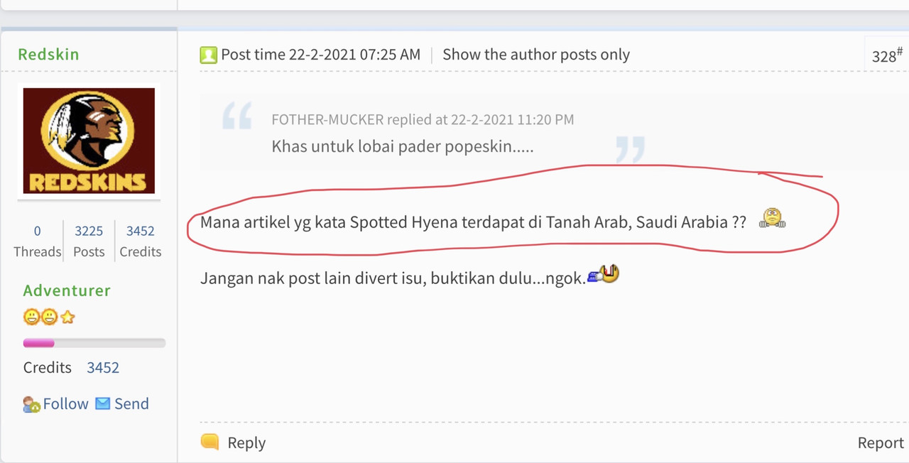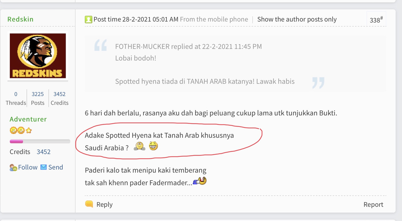 Original posting kau kata spotted hyena tiada di tanah arab. Tetapi bila kau dah tau bahawa spotted hyena ada di tanah arab kau pusing pula ke Arab Saudi.