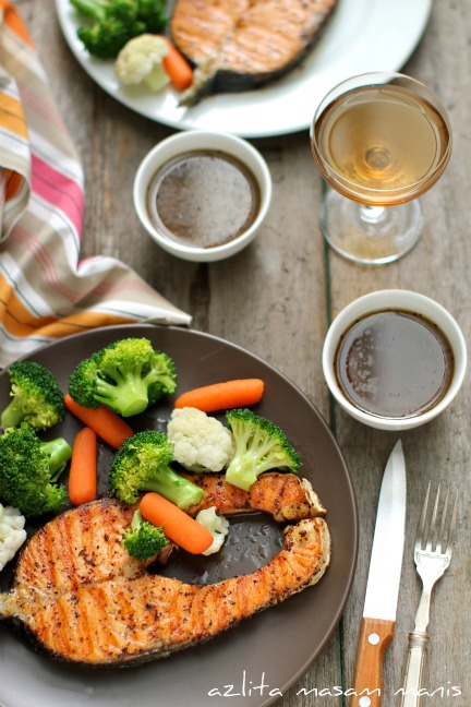 Tumis lada dan bawang putih sampai garing. Masukkan tomato sos, cili sos, lemon jus, madu, garam dan gula.