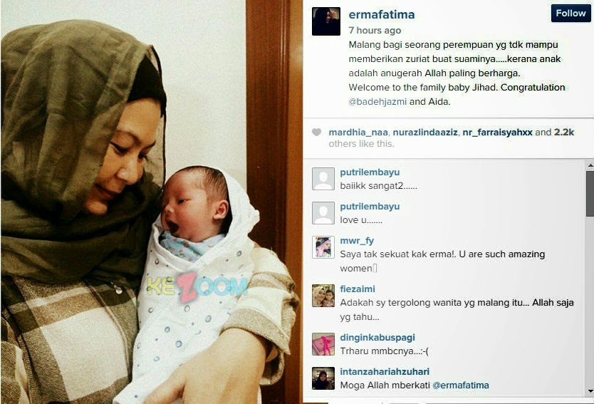 Pelakon dan pengarah terkenal negara, Erma Fatima mengucapkan tahniah kepada suaminya yang juga pengarah, Badaruddin Azmi atas kelahiran cahaya mata sulung, hasil perkongsian hidup bersama madunya, Aida Abdullah.