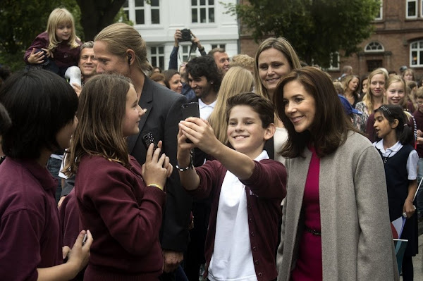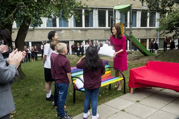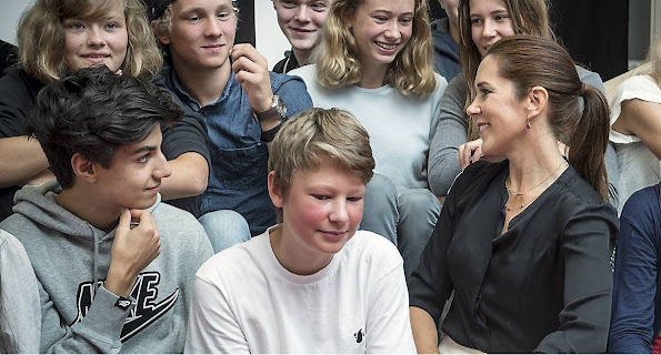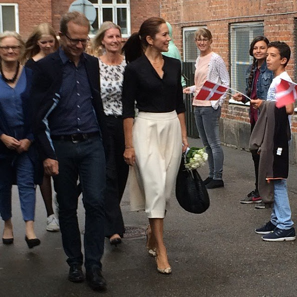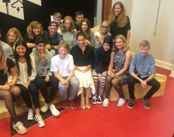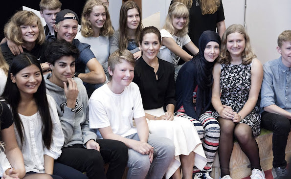 Crown Princess Mary of Denmark participates in the event "Loving Action" (Kaerlig Talt) with Mary Foundation on Guldberg School in Copenhagen on August 25, 2015. (The Mary Foundation has developed educational materials for the country's 8 grade classes to give young people the tools to prevent violent relationships)