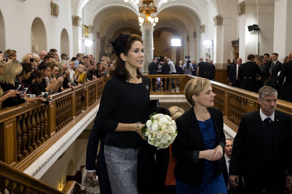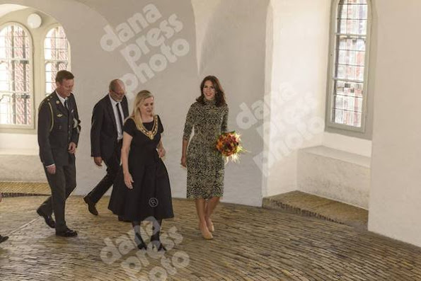 Crown Princess Mary of Denmark attends the "St. Loye Prize 2015" ceremony at Round Tower on October 2, 2015 in Copenhagen, Denmark. (St. Loye prize has been awarded every three years for he best Danish jewelry designer. The prize comes with 100,000 DKK and is accompanied by an exhibition and activities programme in Copenhagen. The aim is to present the many components of jewellery art and holloware – craftsmanship, artistry and design. St. Petersburg Loye or Eligius, is the patron saint of goldsmiths, blacksmiths and all metalworkers. He lived during the early Middle Ages in what is now France. Loye was himself a talented goldsmith who later entered the priesthood and became bishop of Noyon-Tournai.)