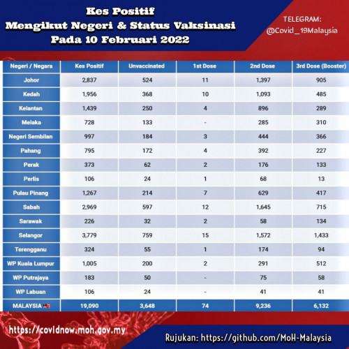 Untuk pengetahuan anda, pada 10 Feb 2022, dari 19,090 kes positif Covid di Malaysia, 80% (>15,000) adalah lengkap vaksin dan/atau dos penggalak/"boostered". .......