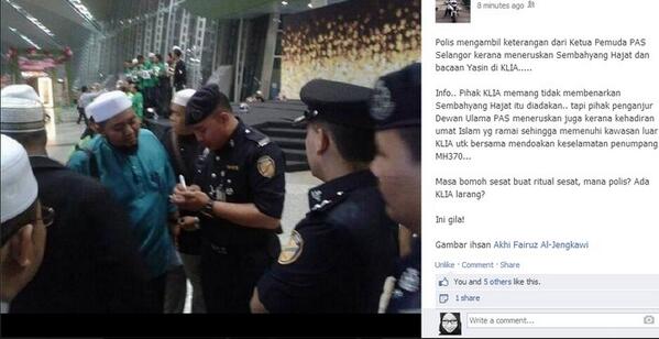 ustaz pas tgh maharajalela fitnah kt fb.bile didesak baru bg tau yg kebenaran utk solat diberikan di surau klcc.tp sbb ramai Sgt, ustaz2 pas ubah kit tmt lain. sbb tu polis bantuan ambik keterangan. tp solat tetap diteruskan. dah pihak klia X kacau, still nk fitnah. mmg ustaz2 pas perangai kotor mcm ni ye? |