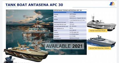 "Ini sesuatu. Saya bisa mengatakam coming soon. Tunggu, available di 2021, kita mengembangkan sebuah kendaraan tempur lainnya yang memiliki konsep yang disebut tank boat Antasena APC 30. Ini adalah sebuah tank boat yang bisa mengangkut 60 prajurit," kata Ade.