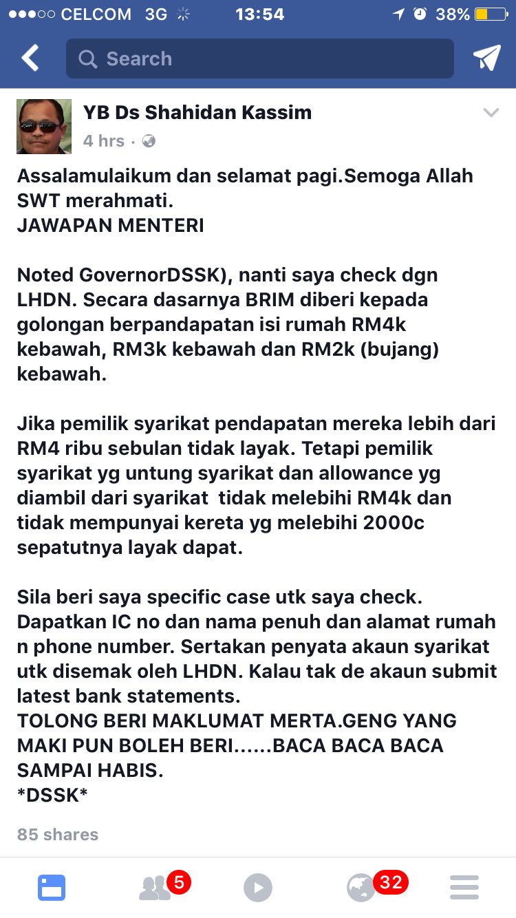 Dah kalau kau boleh stay rumah landed 2storey, laki boleh pakai honda civic..kenapa duk menagih BRIM lg. Peruntukan BRIM ni untuk org yg betul2 perlu. Tolong consider.