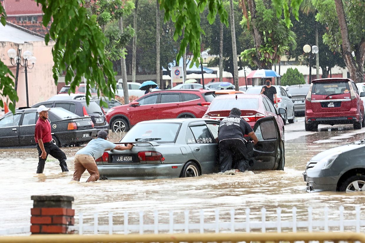 People pushing cars trapped in floodwaters outside Sultanah Aminah Hospital on Aug 2 this year. — Photos: THOMAS YONG & ZAZALI MUSA/The Star