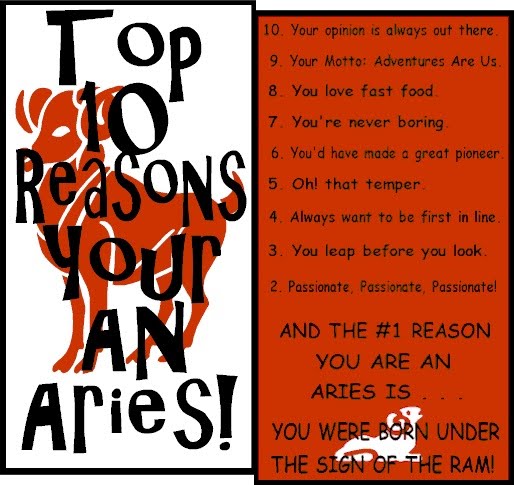 Aries is the first of the zodiac signs. Aries is the sign of the self, people born under this sign strongly project their personalities onto others and can be very self-oriented. Aries tend to venture out into the world and leave impressions on others that they are exciting, vibrant and talkative. Aries tend to live adventurous lives and like to be the center of attention, but rightly so since they are natural, confident leaders. Aries are enthusiastic about their goals and enjoy the thrill of the hunt, "wanting is always better then getting" is a good way to sum it up. Aries are very impulsive and usually do not think before they act - or speak. Too often Aries will say whatever pops into their head and usually end up regretting it later!