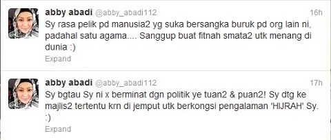haa... kat situ pun kita dah nmpak, klau dia tweet balik mana2 komen yg kutuk keji dia, mesti abby ni sertakan sekali ayat2 kesian, seolah2 dia teraniaya, pastu ada jugak dia selit2 ayat agama, untuk counter attack balik cemuhan trhadap diri dia...