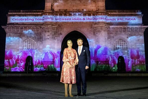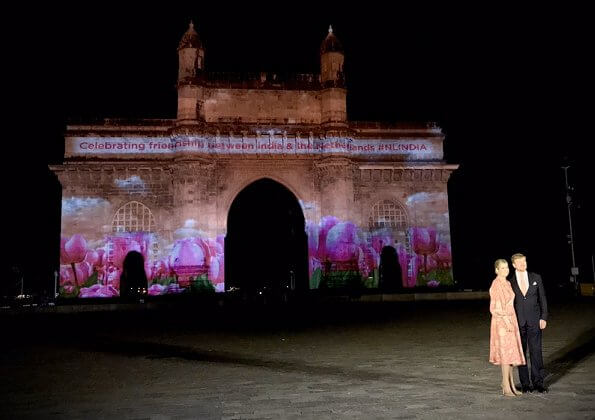 King Willem-Alexander and Queen Maxima of The Netherlands attended a reception held for the Dutch community in India at Taj Mahal Palace Hotel in Mumbai and then made a short visit to the Gateway of India, which was illuminated with a Dutch scene.