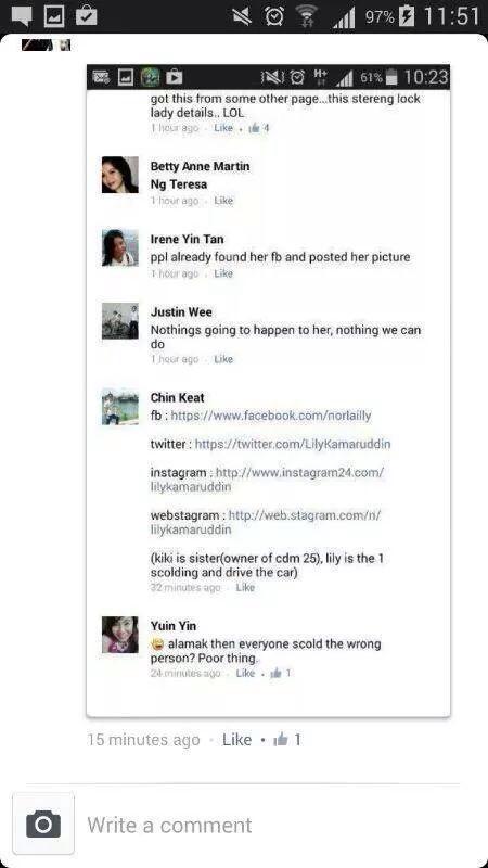 Menerusi akaun FB palsu yang dibuka dengan gambar logo Peugeot dan gambar kecil Kiki, ia tetap dihujani pelbagai komen negatif, seolah-olah menjadi tempat untuk melepaskan geram serta kemarahan mereka terhadap perempuan di dalam video tersebut. Rata-rata pengguna tidak bersetuju dengan tindakan agresif dan cara dia menyelesaikan kemalangan kecil yang membabitkan keretanya dan sebuah lagi kereta yang dipandu seorang lelaki berumur.