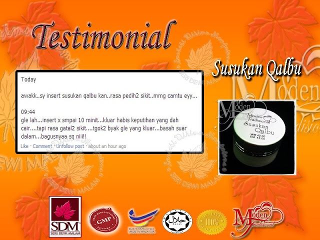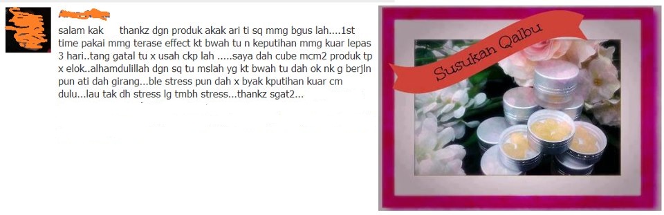 :~tindakbalas selepas memasukkan akan terasa gatal2 selepas1 atau 2 jam selepas dimasukkan dalam vagina.