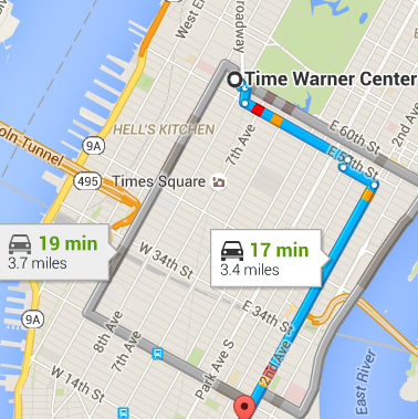 This Google map above shows the distance from the Time Warner Center to the area of East 22nd Street in New York, about 15-20 minutes. Dekat saja.