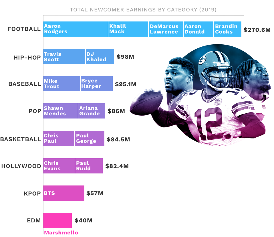 The Forbes global Celebrity 100 ranks "front of the camera" stars around the globe using their pretax earnings from June 1, 2018 through June 1, 2019, before deducting fees for managers, lawyers and agents. Forbes figures are based on numbers from Nielsen Music, Pollstar, IMDB, BookScan, ComScore and NPD, as well as interviews with industry experts and many of the stars themselves. The result is the definitive index of who's making what in the global business of fame.