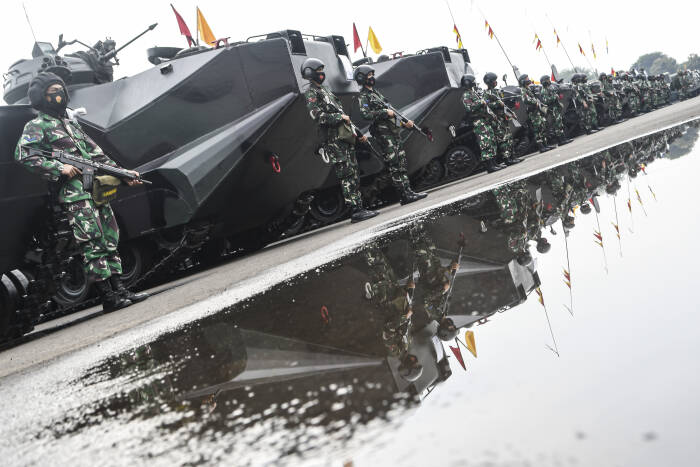Batalyon Kendaraan Pendarat Amfibi 1 Marinir (Yonranrarfib 1 Mar) melaksanakan pergeseran material tempur yang akan digunakan dalam Latihan Operasi Amfibi (Latopsfib) TNI Angkatan Laut tahun 2021 yang bertempat di Garase Menkav 1 Mar Kesatrian Marinir Hartono, Cilandak, Jakarta Selatan, Rabu (20/10/2021).