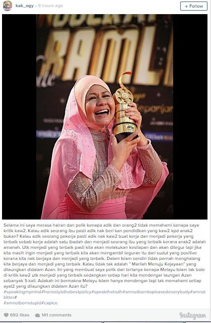 Selama ini saya merasa hairan dan pelik kenapa adik dan orang2 tidak memahami kenapa saya kritik kaw2. Kalau adik seorang ibu pasti adik nak beri kan pendidikan yang kaw2 kpd anak2 bukan? Kalau adik seorang pekerja pasti adik nak kaw2 buat kerja dan menjadi pekerja yang terbaik sebab kerja adalah satu ibadah dan menjadi seorang ibu yang terbaik kerana anak2 adalah amanah. Utk menjadi yang terbaik pasti kita akan melakukan kesilapan dan akan ditegur tapi jika kita masih ingin menjadi yang terbaik kita akan mengambil teguran itu dari sudut yang positive kerana kita nak berjaya dan menjadi yang terbaik. Dalam Islam sendiri tidak pernah menghalang kita berjaya dan menjadi yang terbaik. Kalau tidak tak adalah " Marilah Menuju Kejayaan" yang dilaungkan didalam Azan. Ini yang membuat saya pelik dan tertanya kenapa Melayu Islam tak bole di kritik kaw2 utk menjadi yang terbaik sedangkan setiap hari kita mendengar laungan Azan sebanyak 5 kali. Adakah ini bermakna Melayu Islam hanya mendengar tapi tak memahami setiap ayat2 yang dilaungkan didalam Azan itu?