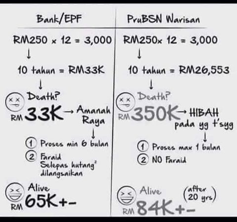 Dan ada sesetengah isteri merana selepas suami dah takde. Masa suami hidup, isteri buat tak kisah tentang kewangan keluarga. Bila suami dah takde, baru terkial kial nak belajar cari duit sendiri. Lebih malang lagi, suami dah mati, baru tau dia tinggalkan banyak hutang. Masa suami hidup, tak pernah kisah nak ambik takaful. Sekarang, tak termampu si isteri nak tampung seorang diri.