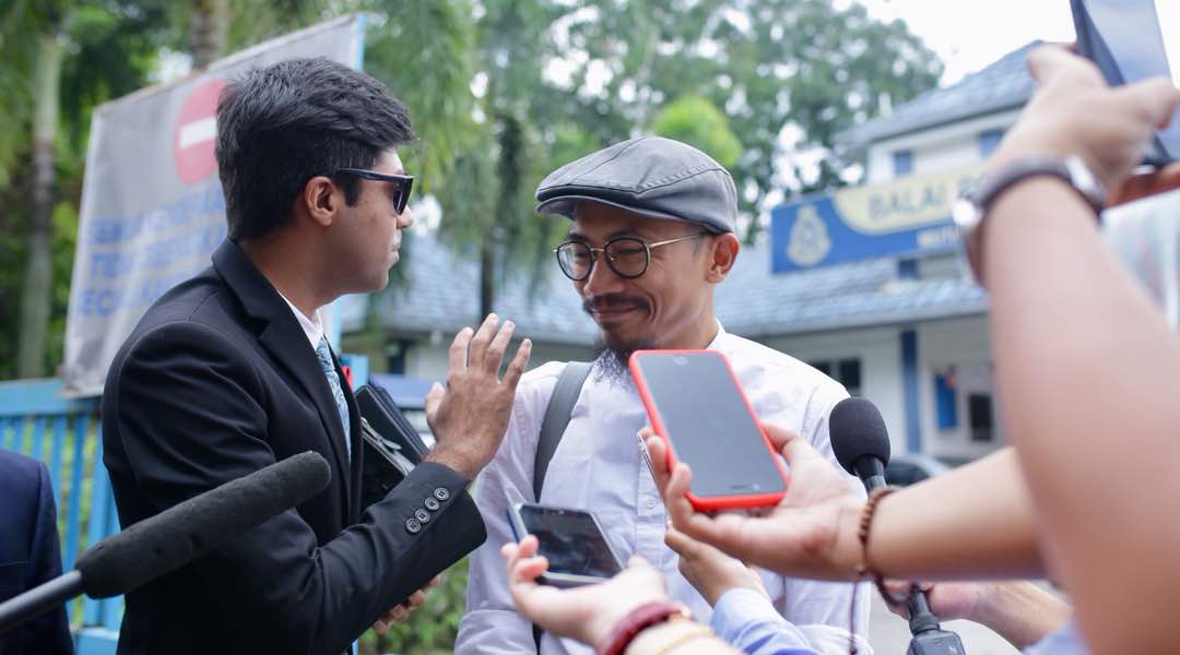 Penyanyi kumpulan Innuendo, Ahmad Tajuddin (kanan) atau dikenali sebagai Taj tampil memberi keterangan di Balai Polis Mutiara Damansara bersama peguamnya berhubung laporan polis dibuat oleh pelakon, Datuk Farid Kamil pada 30 Januari lalu. - Foto Nurul Syazana Rose Razman