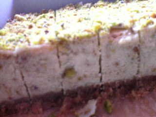 Double boil to melt the chocolate. Spread on top of the cake and sprinkle pistachio. Keep in the fridge for another 6 hours before serving.