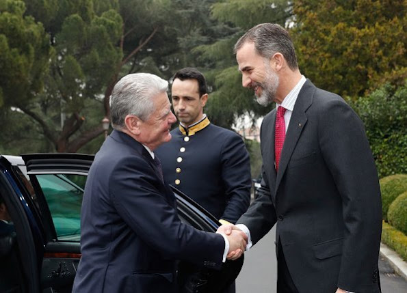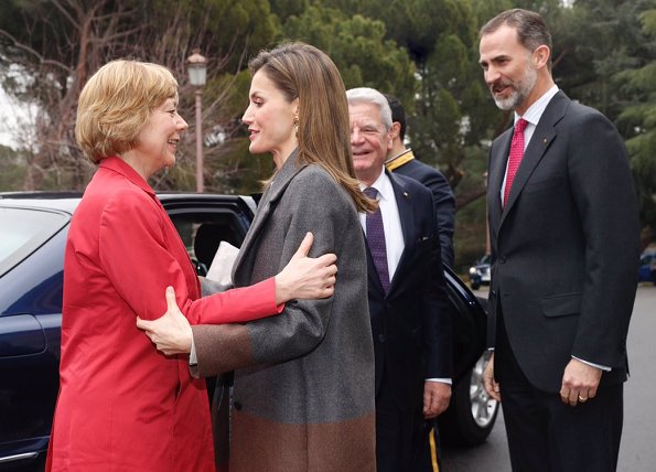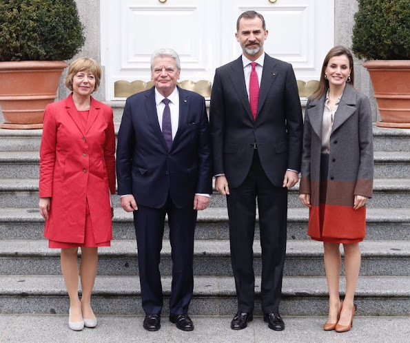 King Felipe of Spain and Queen Letizia of Spain welcoming German President Joachim Gauck and his life-partner Daniela Schadt outside the Palace of Zarzuela in Madrid, Spain. The president's one-day visit is of a private nature.
