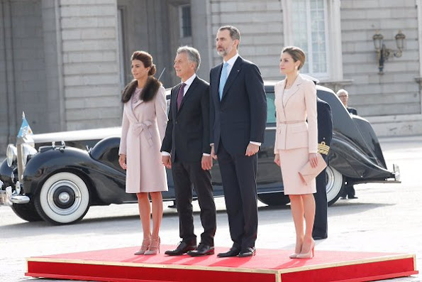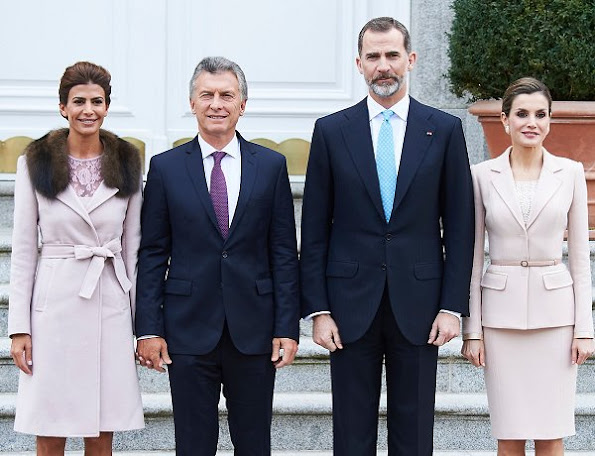 On February 22, 2017, King Felipe of Spain and Queen Letizia of Spain welcome President Mauricio Macri of Argentina and his wife Juliana Awada at the Royal Palace in Madrid, Spain.