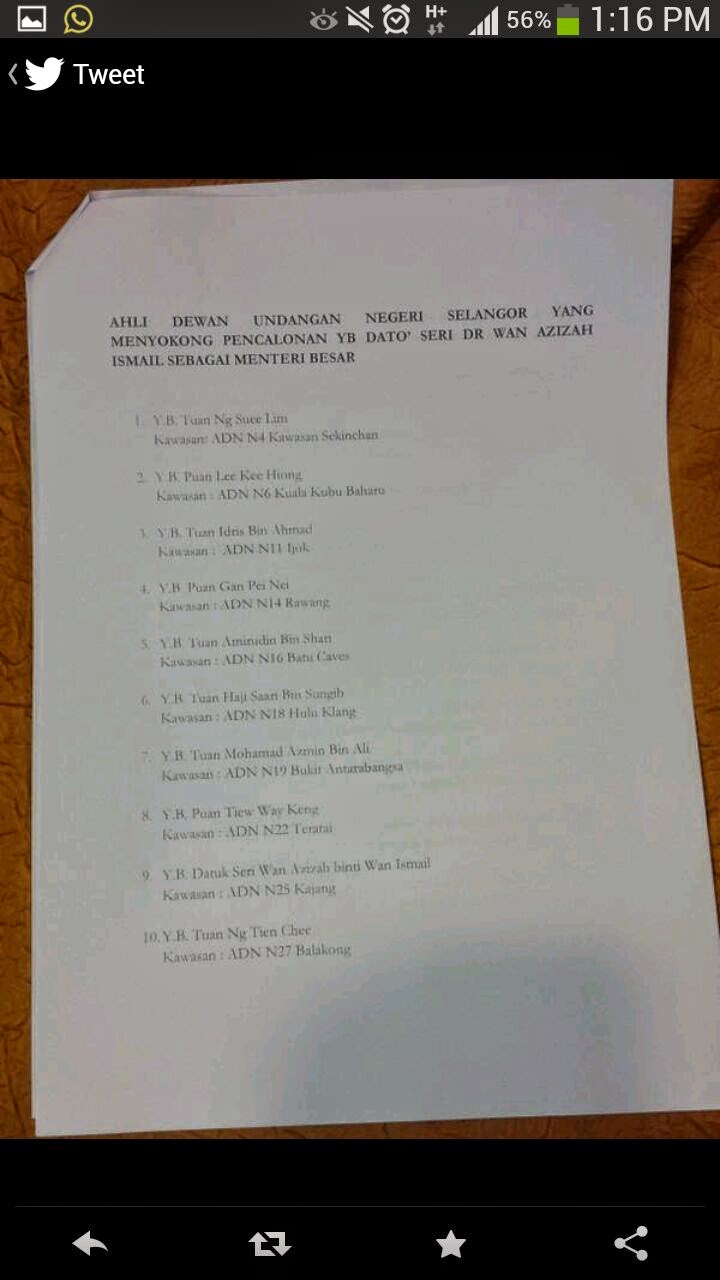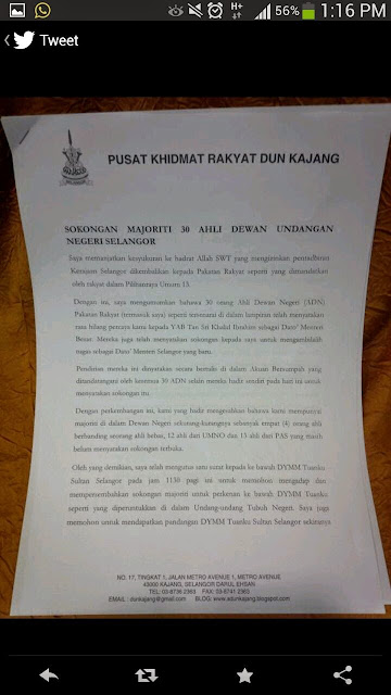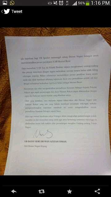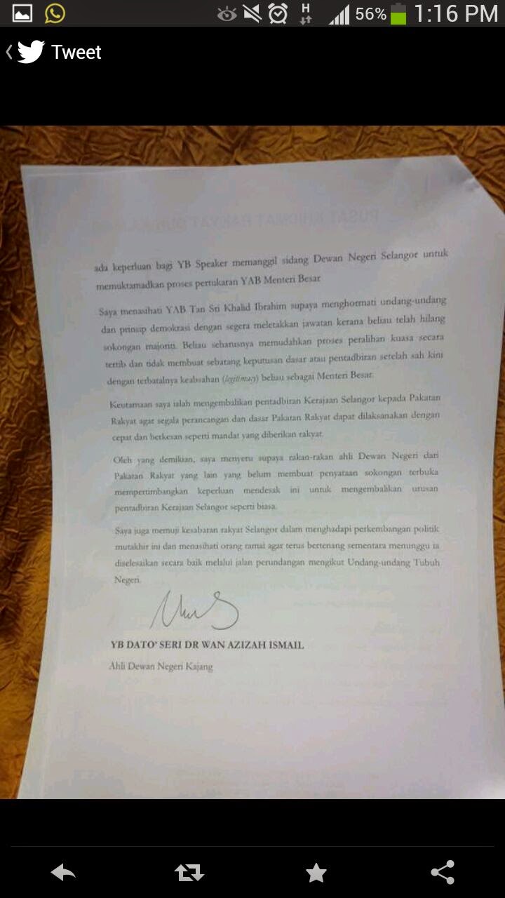 Presiden PKR Datuk Seri Dr Wan Azizah Wan Ismail mengesahkan bahawa pihaknya memiliki sokongan majoriti di dalam Dewan Undangan Negeri Selangor (DUN) Selangor iaitu sebanyak 30 Ahli DUN sekaligus membuktikan Tan Sri Abdul Khalid Ibrahim telah hilang sokongan majoriti di dalam dewan. Dr Wan Azizah berkata kesemua 30 ADUN berkenaan itu juga sudah pun menandatangani Akuan Bersumpah untuk mengesahkan sokongan mereka. Perkara itu dimaklumkan beliau dalam satu sidang media di Subang Jaya hari ini bersama suaminya, Ketua Umum PKR Datuk Seri Anwar Ibrahim dan pemimpin-pemimpin Pakatan Rakyat. "Oleh itu, saya telah mengutus surat kepada Sultan Selangor Sultan Sharafuddin Idris Shah pada pukul 11.30 pagi tadi ini untuk memohon perkenan menghadap dan mempersembahkan sokongan majoriti untuk perkenan Tuanku seperti yang diperuntukkan di dalam Undang-Undang Tubuh Kerajaan Negeri Selangor. Saya juga memohon untuk mendapatkan pandangan Sultan Selangor sekiranya ada keperluan bagi Speaker DUN Selangor memanggil sidang DUN untuk memuktamadkan proses pertukaran Menteri Besar," katanya dalam sidang media itu. Beliau yang juga ADUN Kajang turut menasihati Abdul Khalid supaya menghormati undang-undang dan prinsip demokradi segera meletakkan jawatan kerana beliau telah hilang sokongan majoriti. "Beliau seharusnya memudahkan proses peralihan kuasa secara tertib dan tidak membuat sebarang keputusan dasar atau pentadbiran setelah sah kini dengan terbatalnya kelayakan beliau sebagai Menteri Besar.