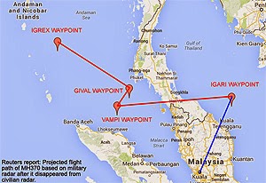 Setelah itu, pesawat berkenaan dikesan meneruskan perjalanan ke timur laut... laluan penerbangannya adalah seperti di atas.