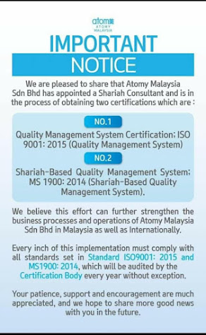 Bisnes tanpa modal MLM e-dagang Atomy Korea-Malaysia diperakui Patuh Syariah ( Syariah Compliance mulai 24 Jun 2022 oleh Syariah Advisory Council (SAC). Malah rangkaian produk-produk Atomy buatan asli Korea yang dipasarkan di Malaysia juga telah mendapat Pengiktirafan Sijil Halal JAKIM disamping pengesahan Sijil Halal Korea Selatan yg di"endorse" oleh JAKIM Malaysia.