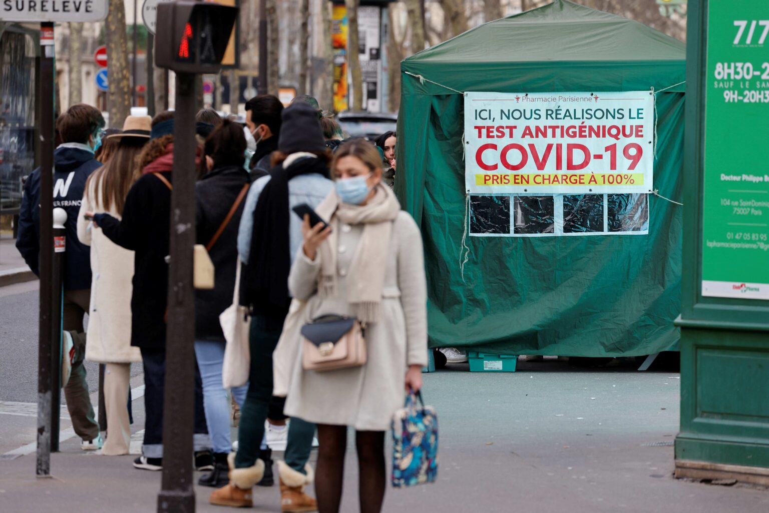 ORANG RAMAI berbaris di luar sebuah farmasi di Paris untuk mendapatkan ujian antigen Covid-19 pada 6 Januari lalu. - AFP