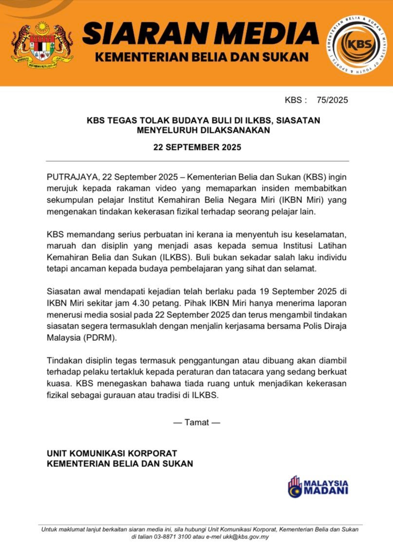 Susulan itu, Kementerian Belia dan Sukan (KBS) dalam satu kenyataan menjelaskan pihaknya memandang serius kejadian buli tersebut.